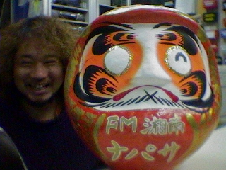 今日はDelicate発売1周年記念ということで、たーくさんFAX頂きました。そして長くサポートギタリストをしてくれて いる浜野基永氏が初登場してくれた。それからゲストは実力派シンガー”KUZUHA”さん。さらに先週のゲスト”細川智則さん” もかけつけてくれ、いつもにくらべ、スタジオはたいへんにぎやかなのだった。(でも細川氏は生KUZUHAを目当てに来たらしい)でも、まー早いものだね、時が過ぎ行くのは・・・あれからもう1年かー・・・そんな望郷にも似た想いで目を細めて遠くを見やる、そん な気持ちで1曲目は久々”またせてごめん”からのスタートになった。今日のゲストは、実力派女性アーティスト”KUZUHA”。彼女の生唄しびれました。すごく高音が綺麗に出るひとで(少しの緊張 といきなりの唄という事で本人曰く声が出ていなかったらしいが・・・)本当にライブが見てみたいな。彼女のサポートで浜野氏も 来たのだけれど、なかなか息も合っていて、良い雰囲気だったよ。特筆すべきは唄だけではなく、アーティスト写真の懲りようも スバラシカッタ。見てもらえばわかるが、延々とこの構図をねらい続けてようやっと撮ったのがこの写真。ずーとやってるんだぜ!ず〜っと。しまいにゃモトの頭のだるまが、落っこってワシのギターに直撃!チャンチャン。みんなで応援しよ う!