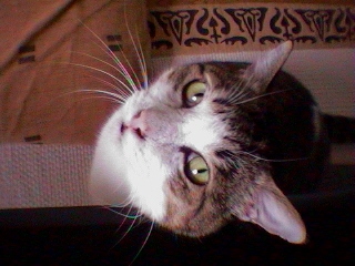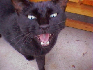今月からファックステーマが変わったのでまず自分のペット自慢(でもないけど)をしました。我がアパートは、それぞれの部屋に野良ネコがあたかも割り当てられたように、一匹ずつ配置され、部屋への侵入権、えさの独占供給権を一方的に行使できるシステムになっているのだった。そんなしくみに我々が気づき始めたころ、頻繁にやってくる一匹の猫 がいた。そいつは他のネコに比べかなりデカク、鳴き声が大変不細工であった。しかし折角現れた我が家の新しい仲間である。敬意と親しみを込め”担当さま”と名付けた。担当さまは度々お姿 をお現しになった。そして好物である”焼き海苔”をたいへん多く召し上がった。そしていくらでも催促し、可愛くない声でお鳴き遊ばれた。しかし常備している”キャラット”は口にあわないのか、あまり召し上がらなかった。その身勝手さと、傲慢さと、アミドにぶら下がるなどの悪事が重なり、いつしか彼はただの”担当”と冷たく呼び捨てにされて、 かつての敬謙な取り扱いは無くなってしまったのである。