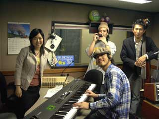 本日のゲストはトリオユニット"ジェリーフィッシュカフェ"です。そうあの(クラゲ)のジェリーフィッシュです。とにかく海とかが大好きなVo,のはーみんさんが地元横須賀の海に抱く幻想(ジェリーフィッシュカフェは潮が引いたあとの地底の中にあるらしい、みたいな)から付けられたものです。アメリカンバンド"ジェリーフィッシュ"の愛好家がつけた訳ではないのです。今日はVoのはーみんさんとDrのじんくんが来てくれました。また何とGtのきむりんは今日パパになったそうですう!!おめでとう!さらに本日は今日マスタリングが終わったばかりの音源を本邦初公開だったのでした。はーみんさんはエフエム横須賀でも有名なDJで僕も出演させてもらったことがあるのですよ。