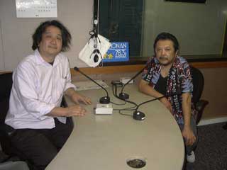 本日のゲストは横浜を中心に活動しているロックバンドRox Voxのリーダー中村祐介さんとKeyの川勝陽一さんです。中村さんは横浜市歌をブルースで歌っていたり、ディスカウントストア、ダイクマの歌?(宣伝の声かな?)もやっていたりでとても有名なシンガー&ギタリストなのです。また川勝さんはBBストリートでライブイベントもやっていて僕もよくお世話になっている方です。今日は5月30日行われる関内7thAvenueでRoxVox主催のコンサートイベントの宣伝に来てくださいました。昔横浜にもたくさん砂浜があった。それを再び再生させようじゃないか!というのが主旨。あつーく語ってくれました。 あと中村さんの生歌(ダイナミックー、ダイクマ−!)も特別にやってくれました。ありがとうございました。